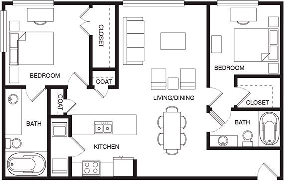 The gracious entry foyer leads to an open kitchen with custom stained walnut cabinetry, granite countertops, and a built-in dining banquette (in select one bedroom homes).